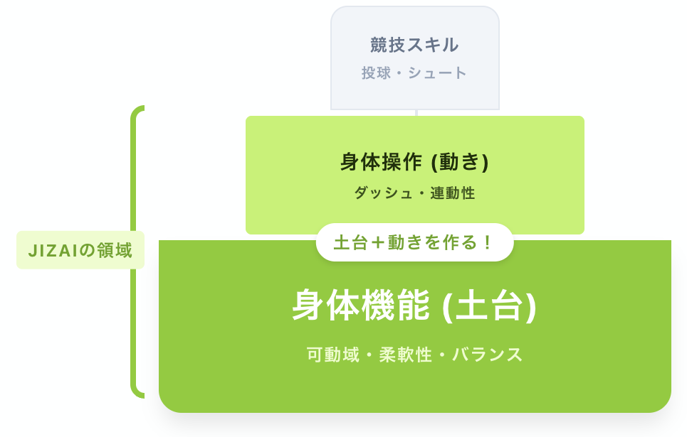 JIZAIは、多くのスクールが競技スキル(一番上)に集中する中で、あえて「土台」を専門に鍛え上げます。